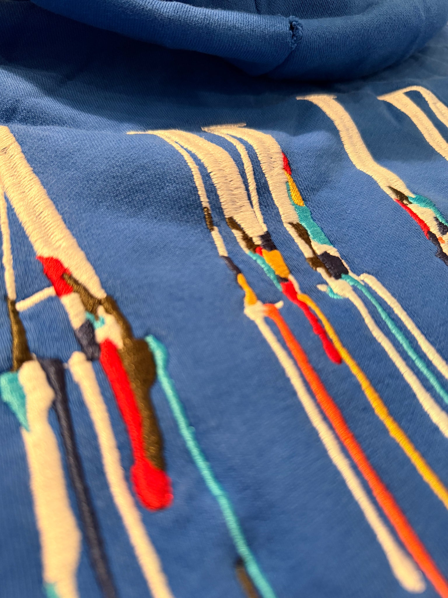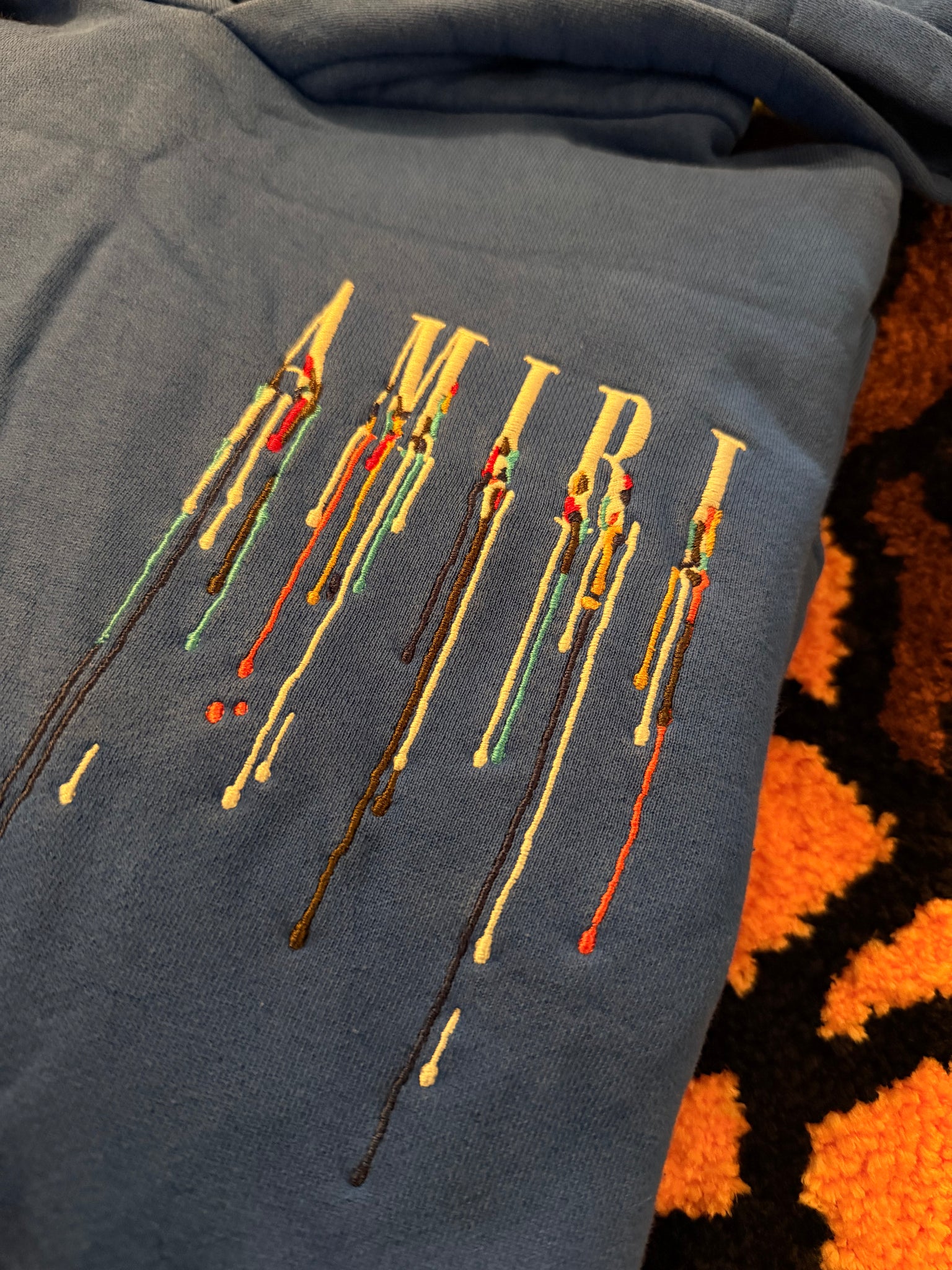 - Detail: Features AMIRI’s signature multicolor paint-drip embroidery across back and sleeves, making each piece unique.