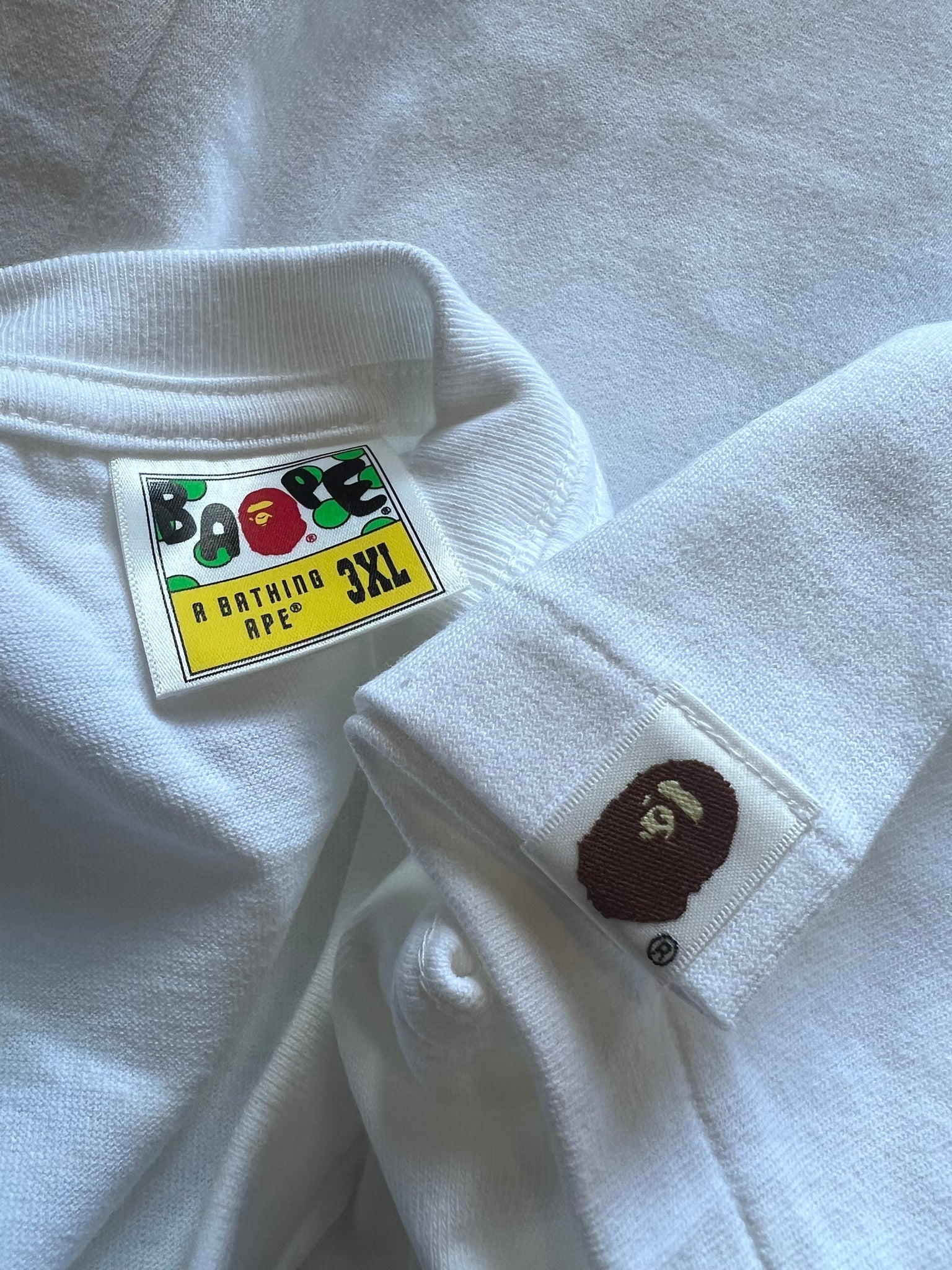 - White tee with “A Bathing Ape” text on chest