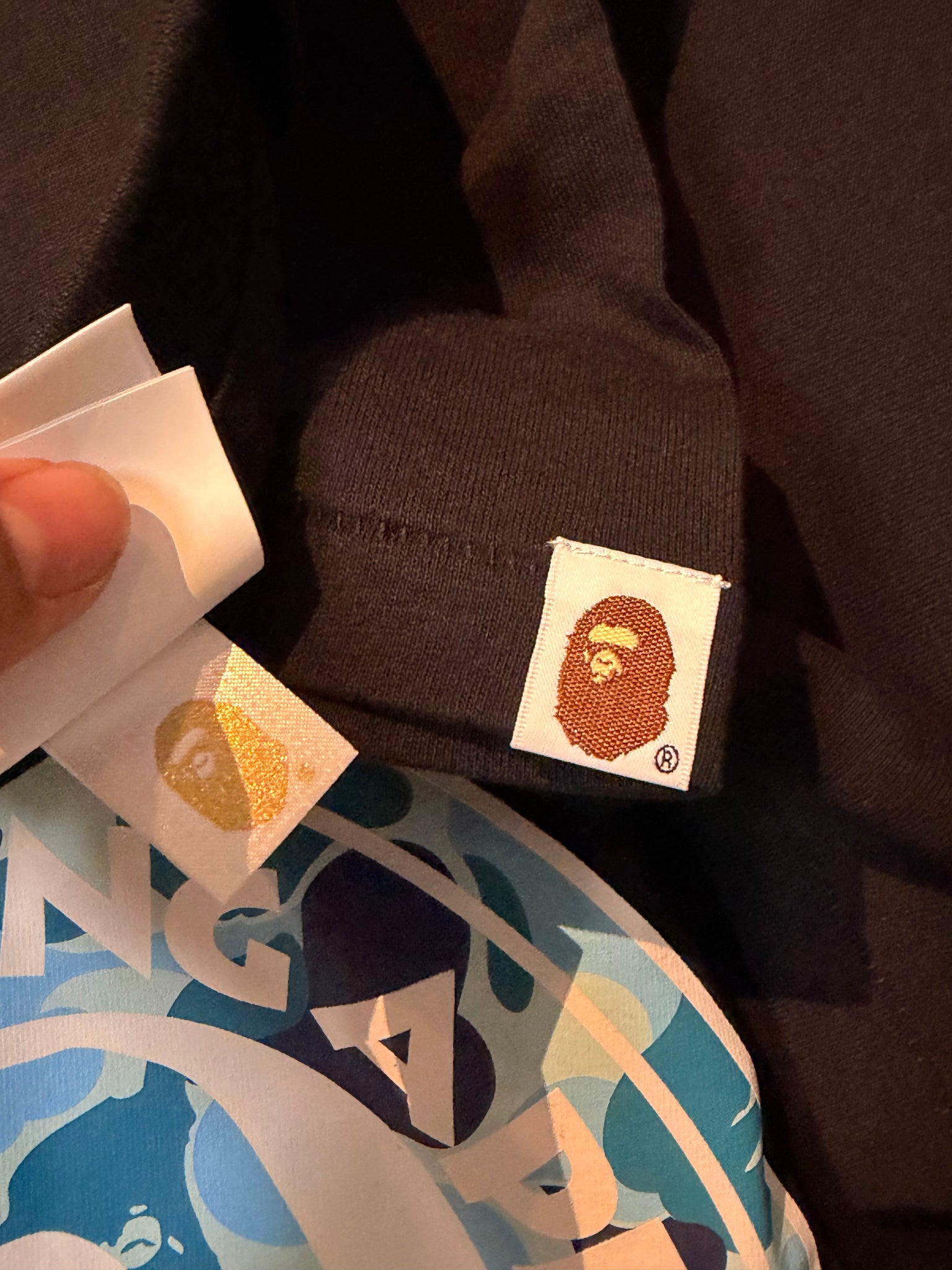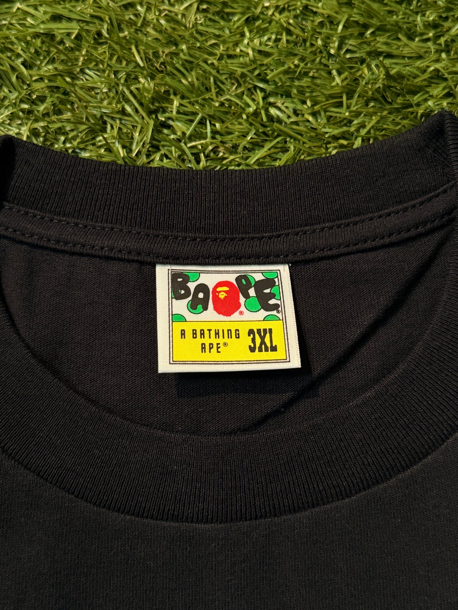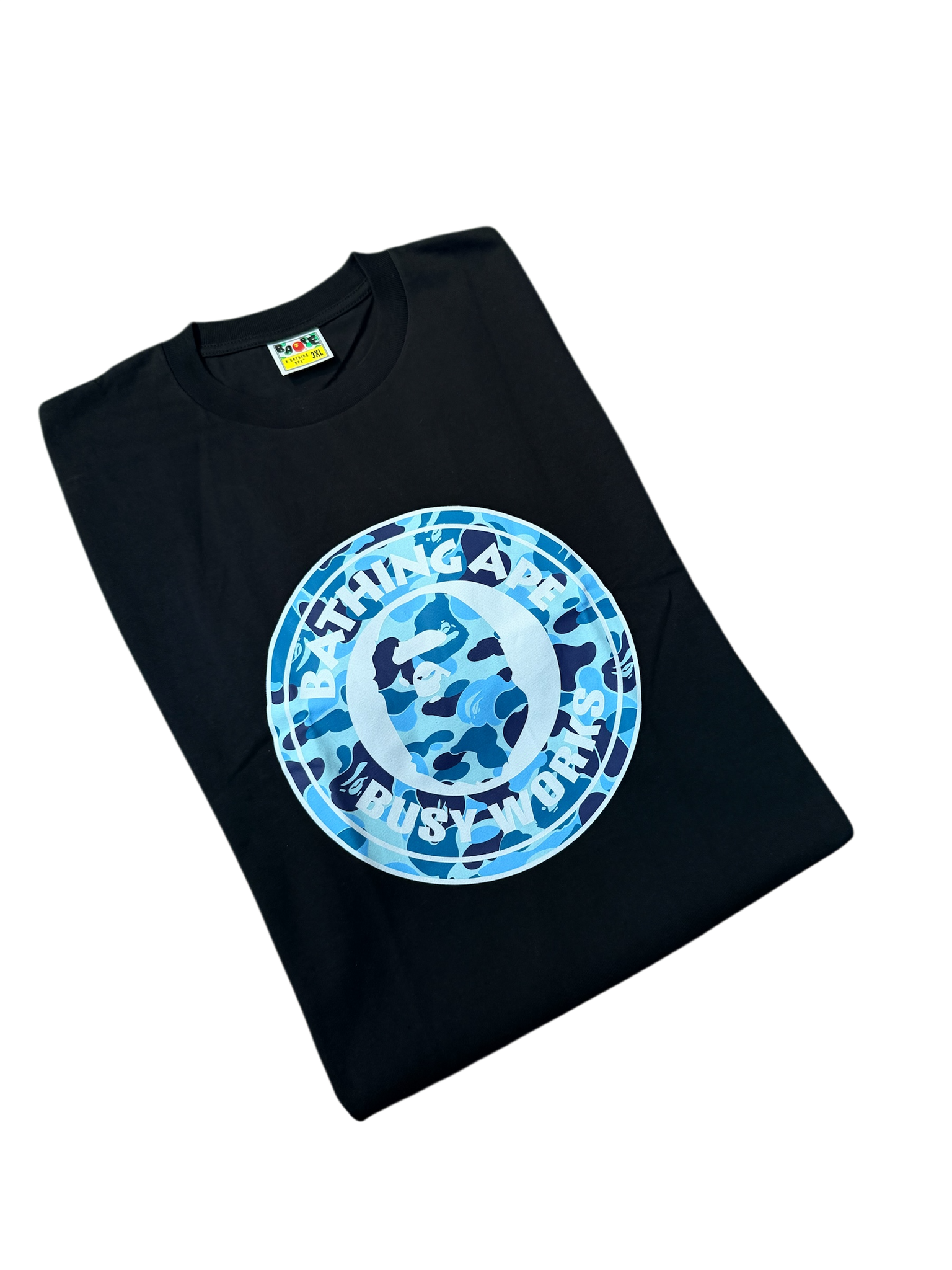- Colorway/Design: Black tee with Blue ABC Camo “Busy Works” circular Ape Head logo print