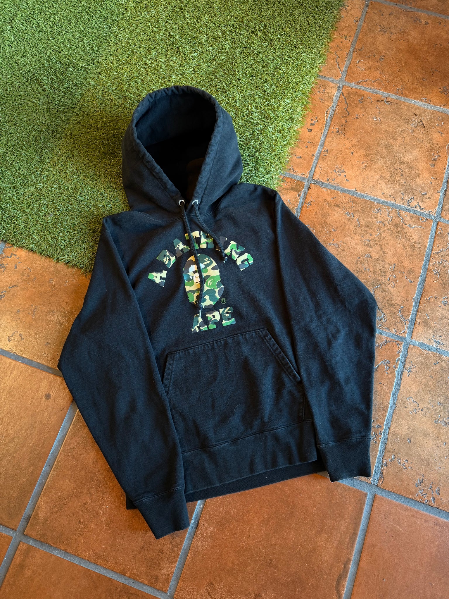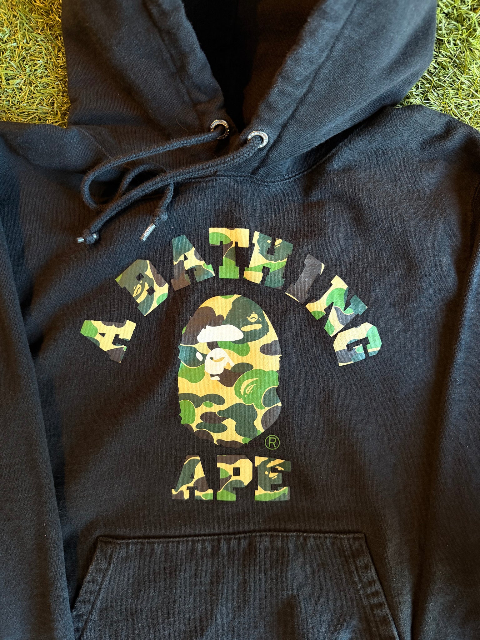 - Colorway/Design: Black base with classic Green Camo “A Bathing Ape” college logo print