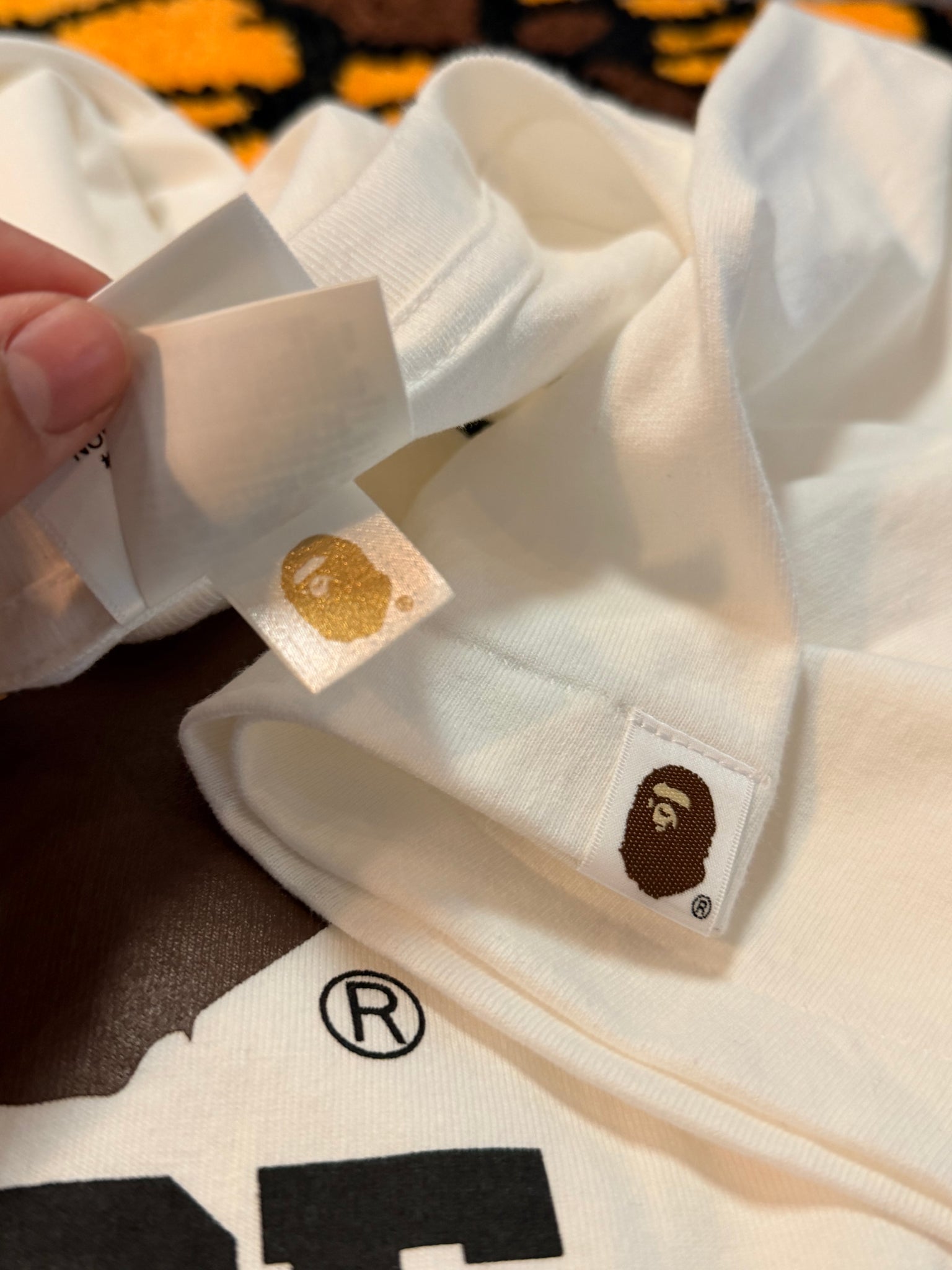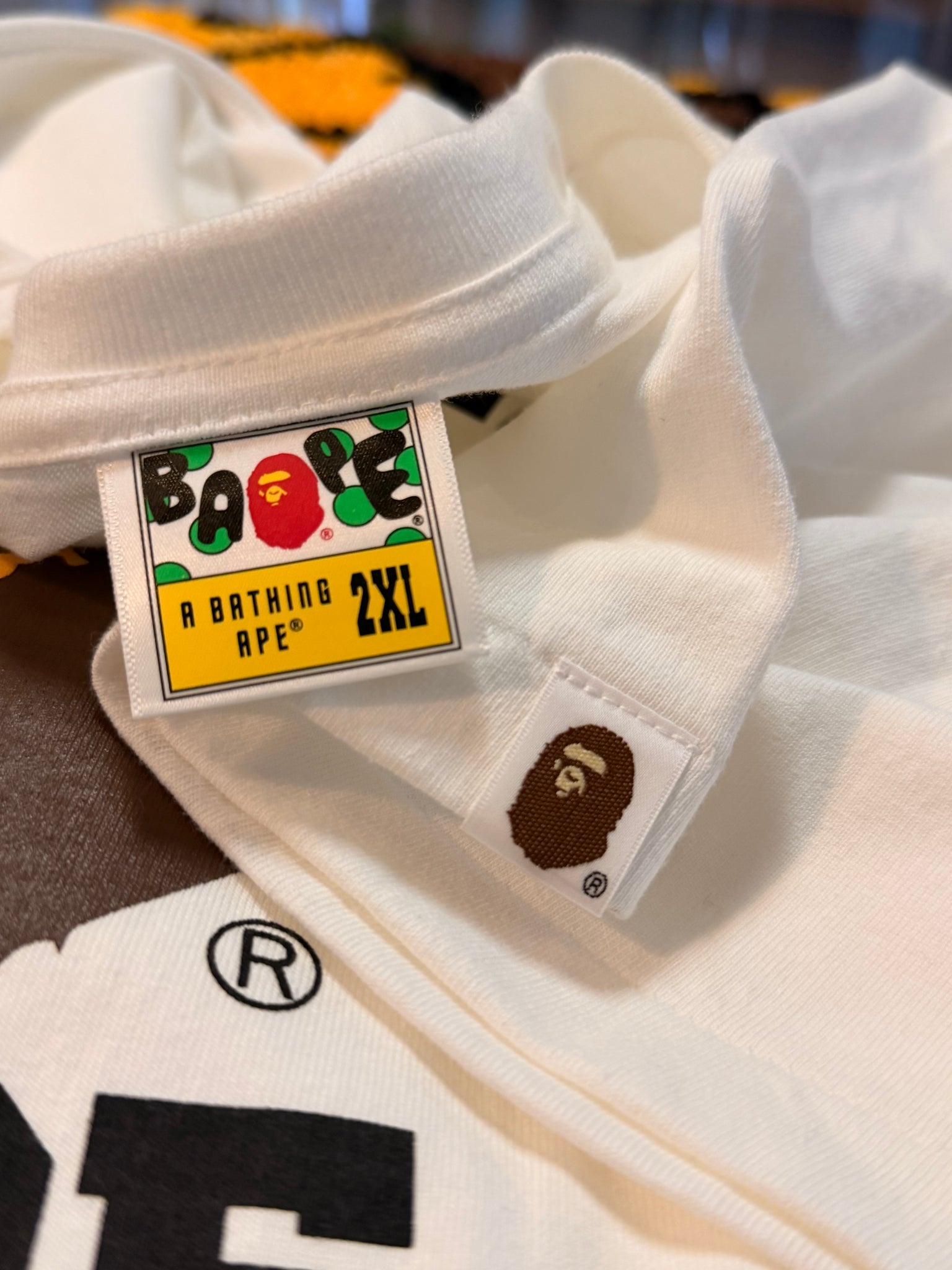 - Colorway/Design: White tee featuring brown Ape Head logo with bold “A Bathing Ape” text across chest