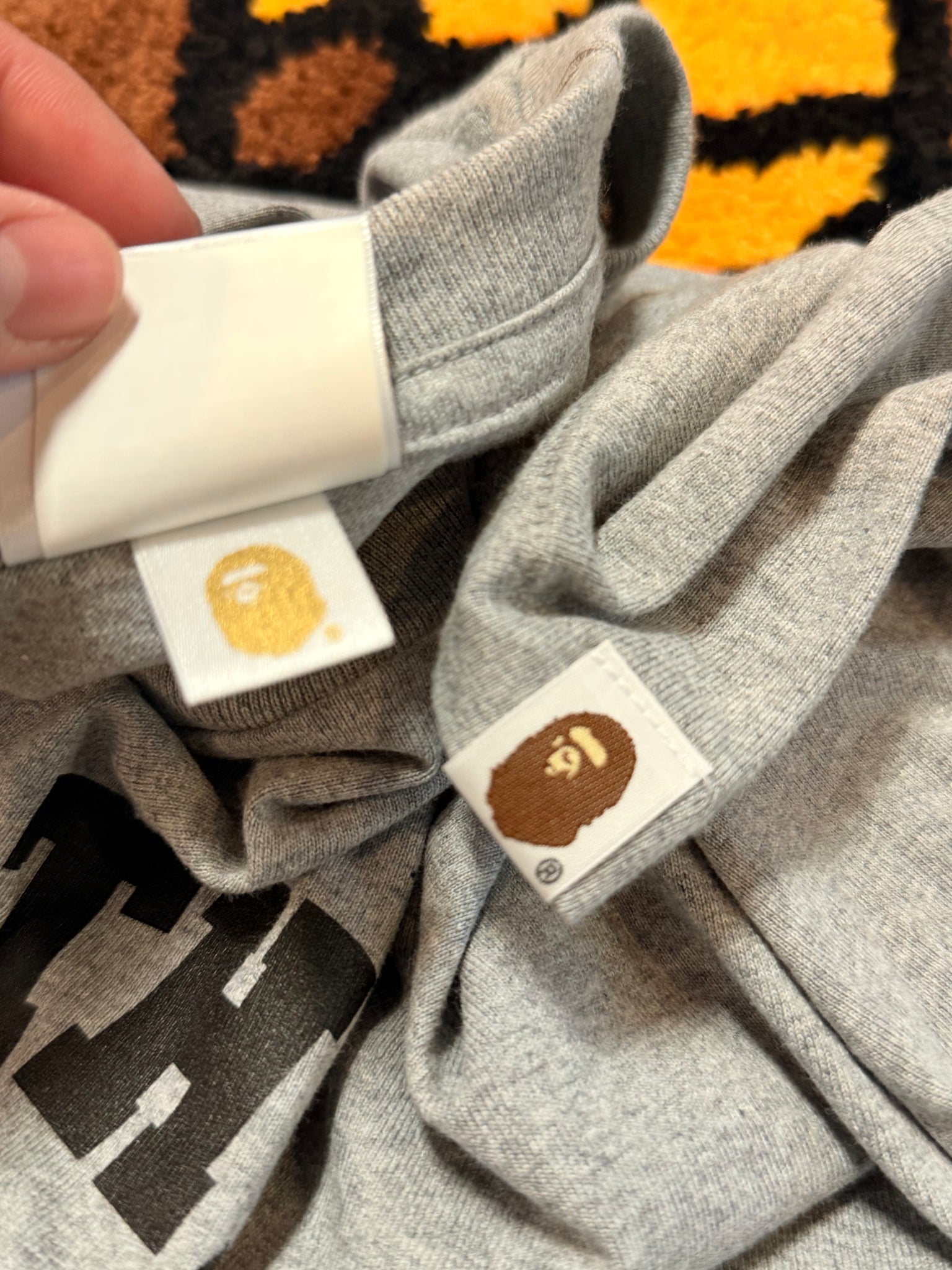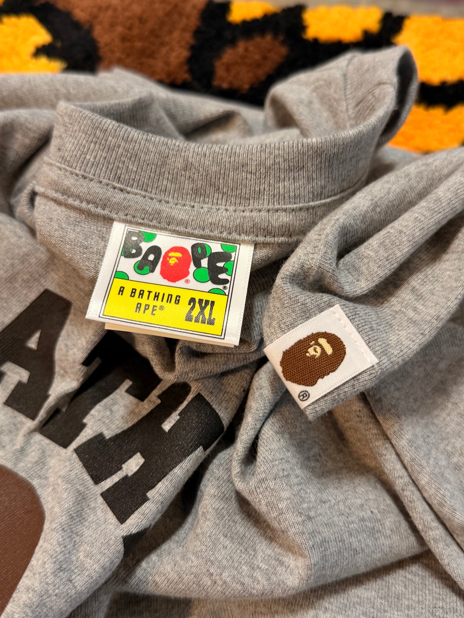 - Colorway/Design: Heather grey with brown Ape Head logo and “A Bathing Ape” arch text