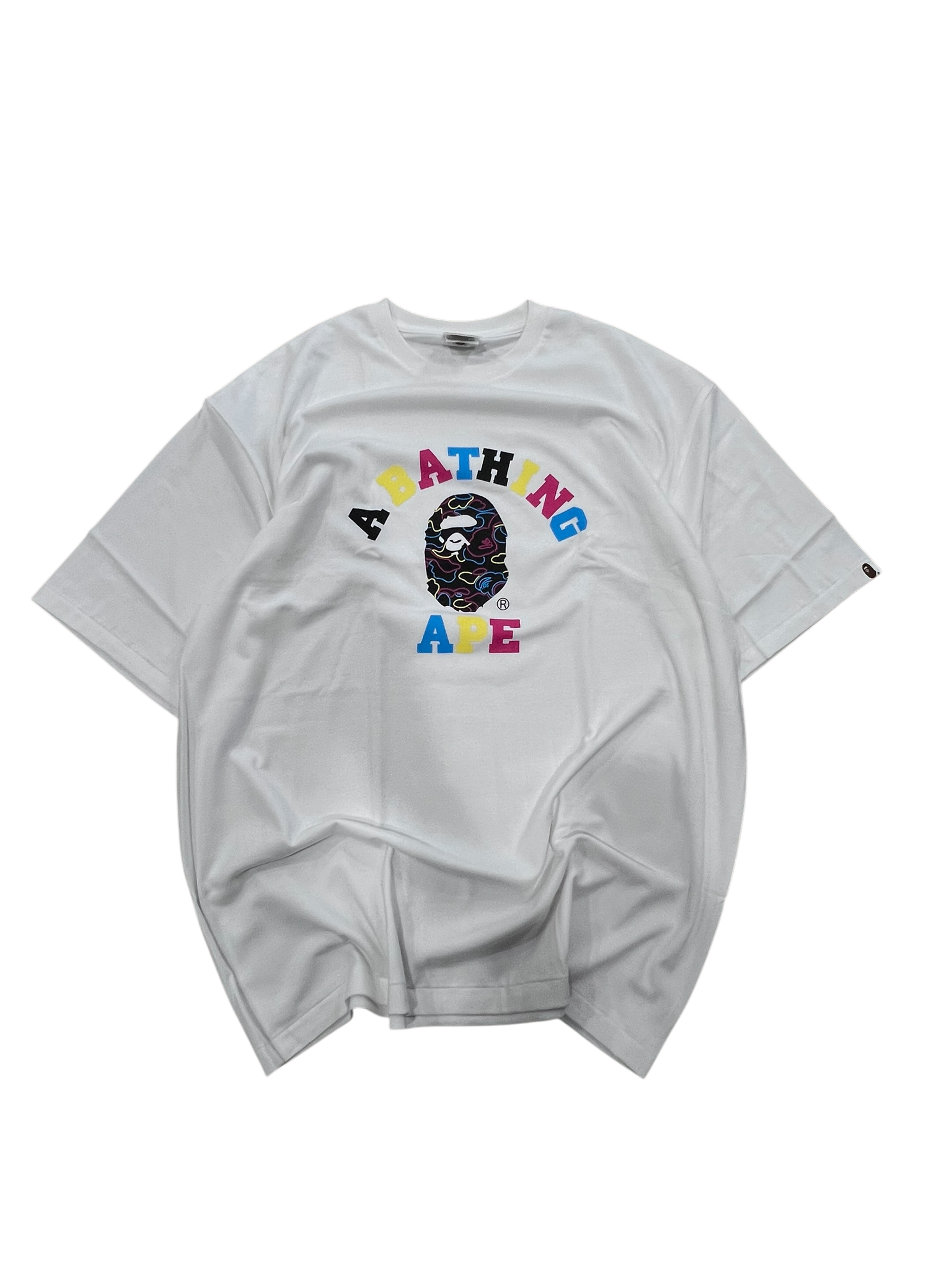 - Colorway/Design: White tee featuring the classic Ape Head logo in multicolor camo with rainbow “A BATHING APE” arch lettering