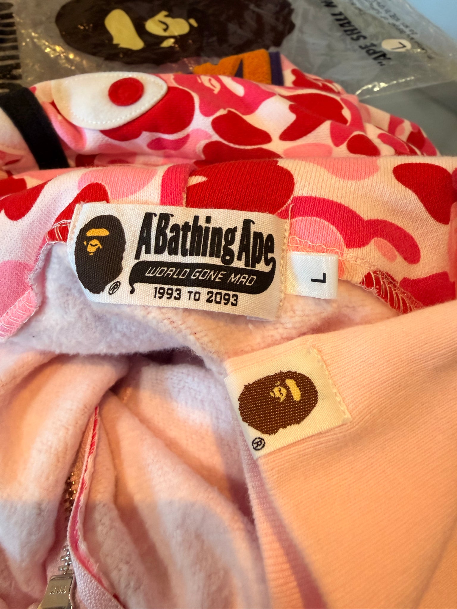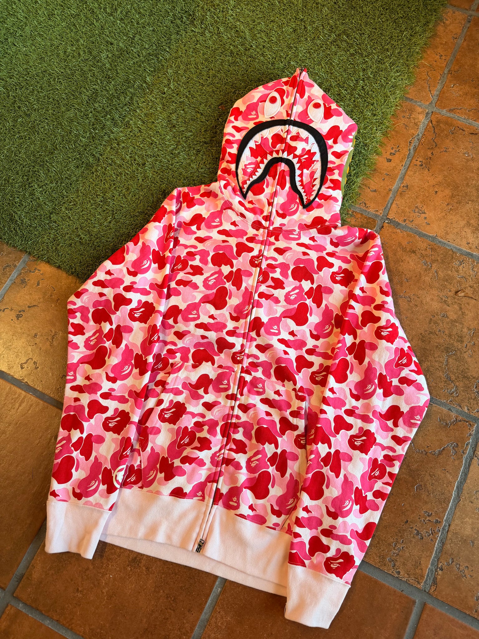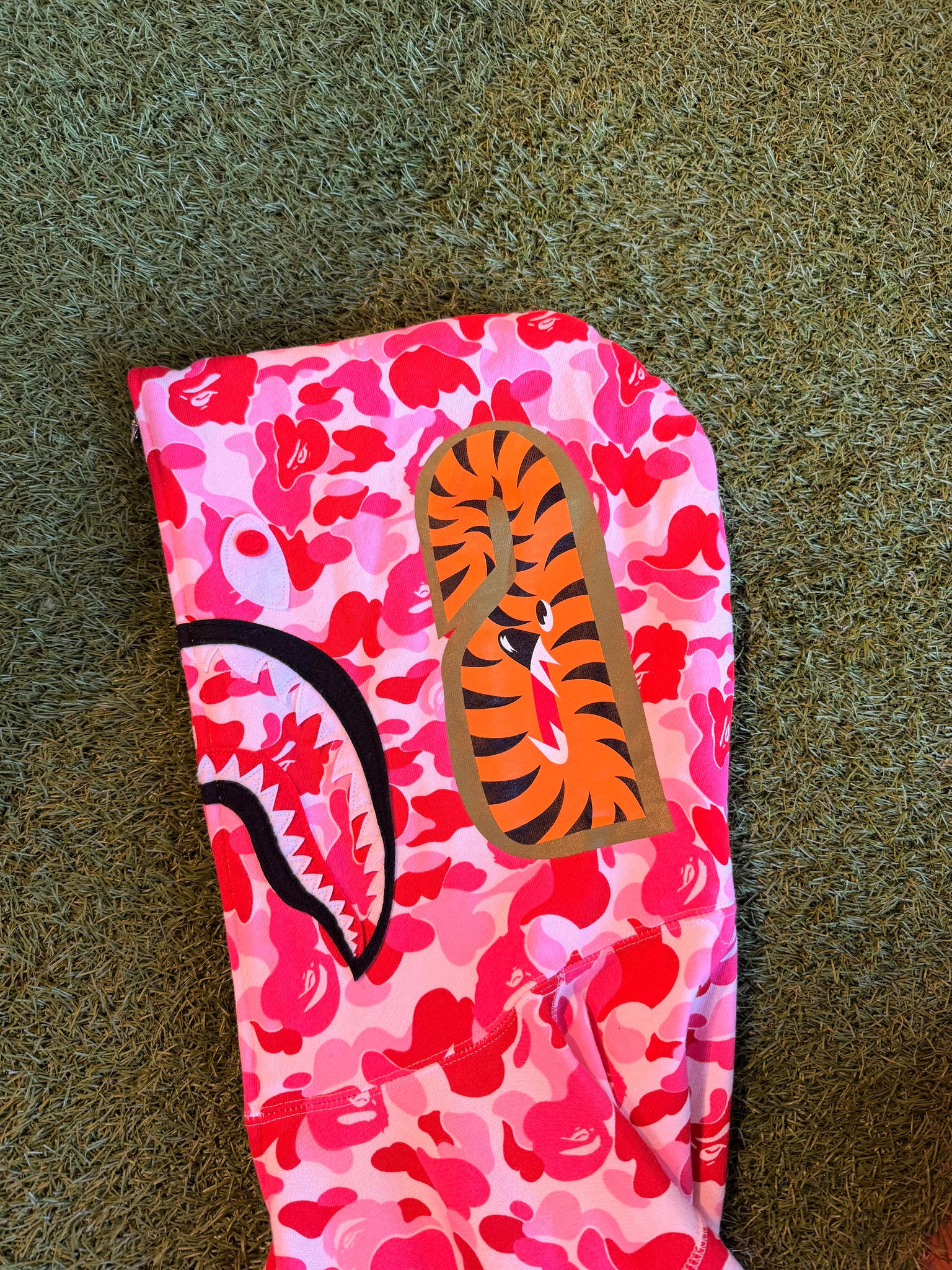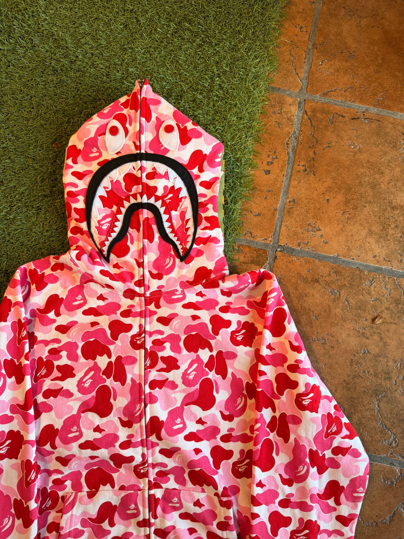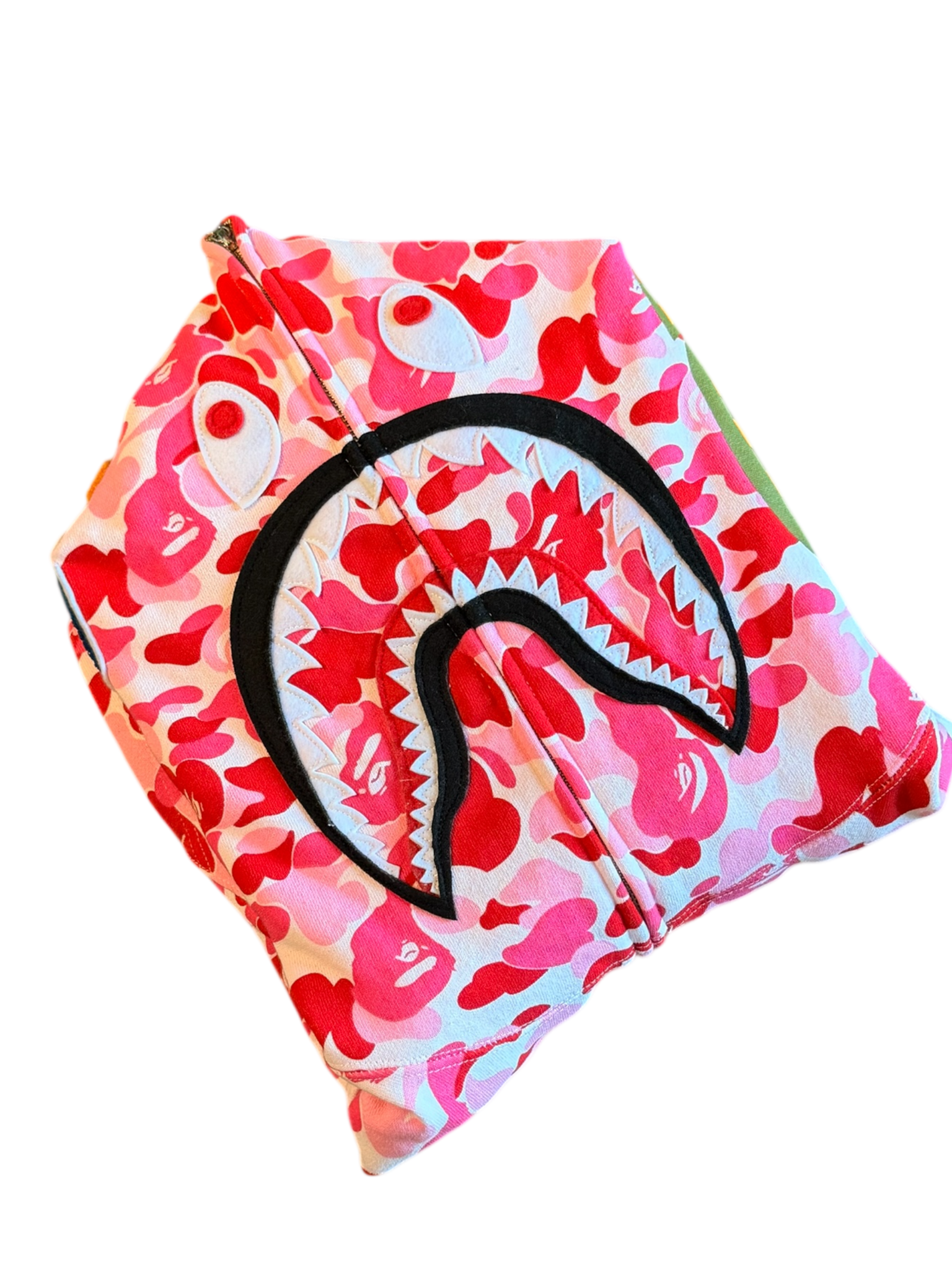 Details: Classic BAPE Pink Camo Shark Full Zip with WGM and Tiger patches. Made in Japan with heavy cotton fleece, full embroidery, and OG Ape Head tags.