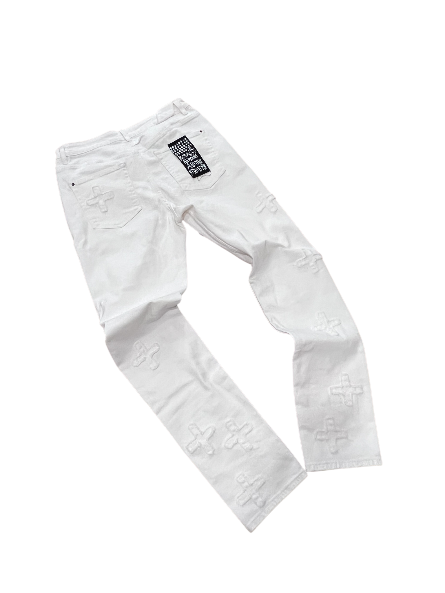 - Colorway/Design: White denim with tonal embossed cross patches and signature Ksubi tag detailing on back pocket