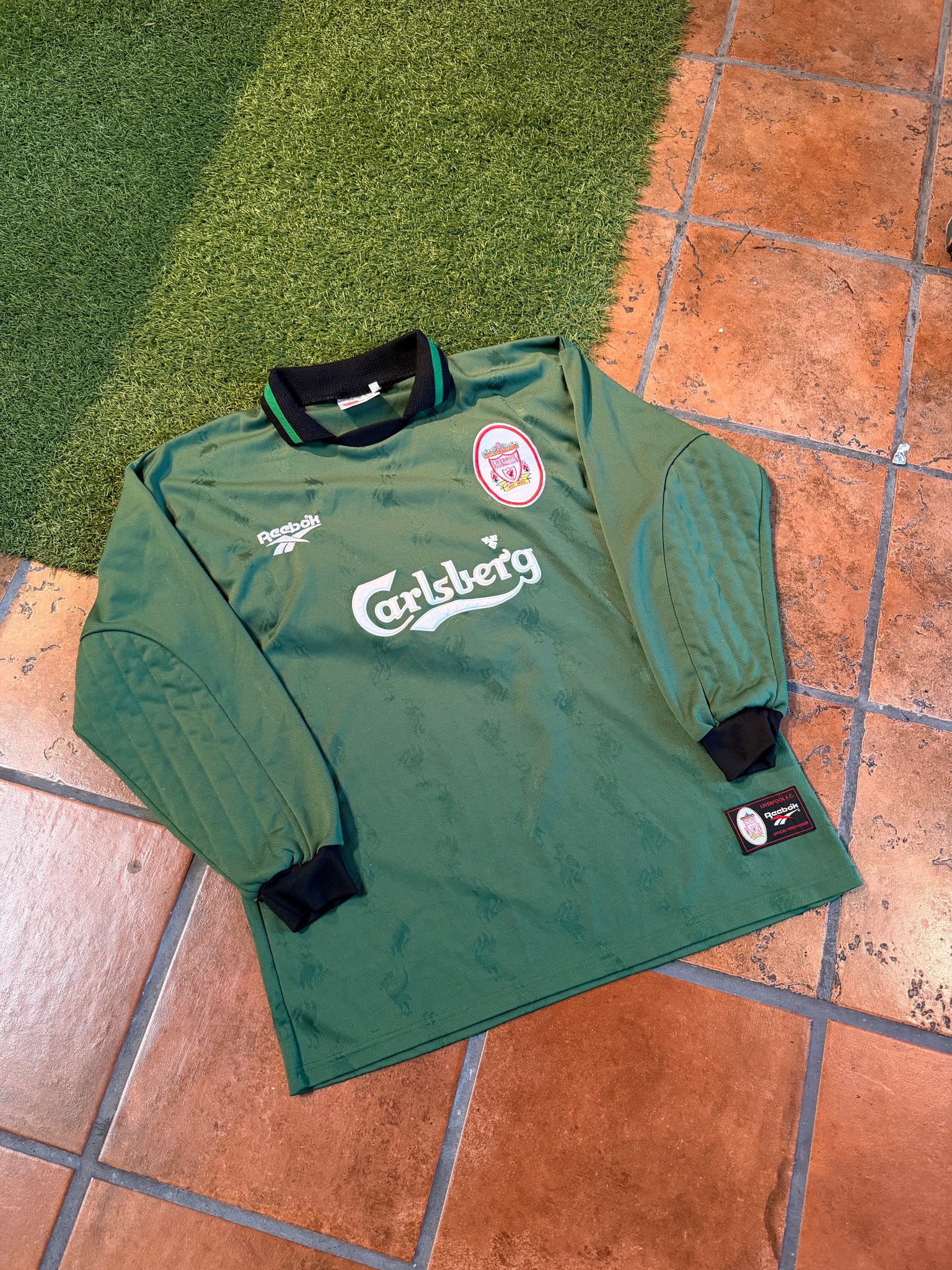- Detail: Authentic vintage Liverpool goalkeeper jersey from the Reebok x Carlsberg era, featuring quilted padded sleeves and embroidered crest. Rare collector’s piece representing classic Premier League heritage.