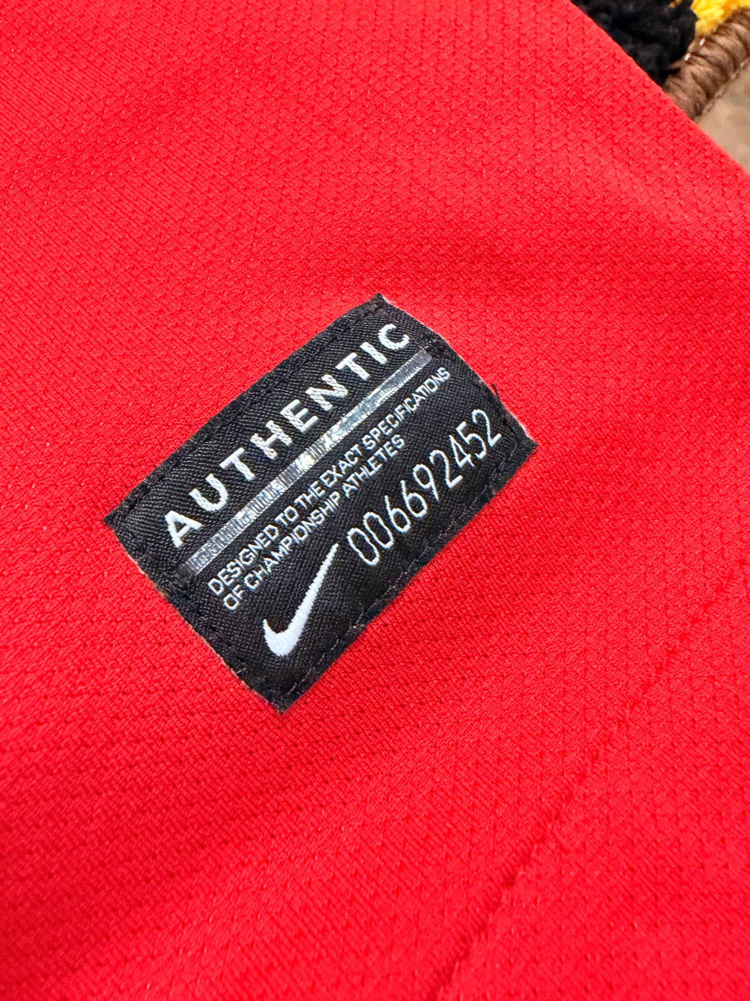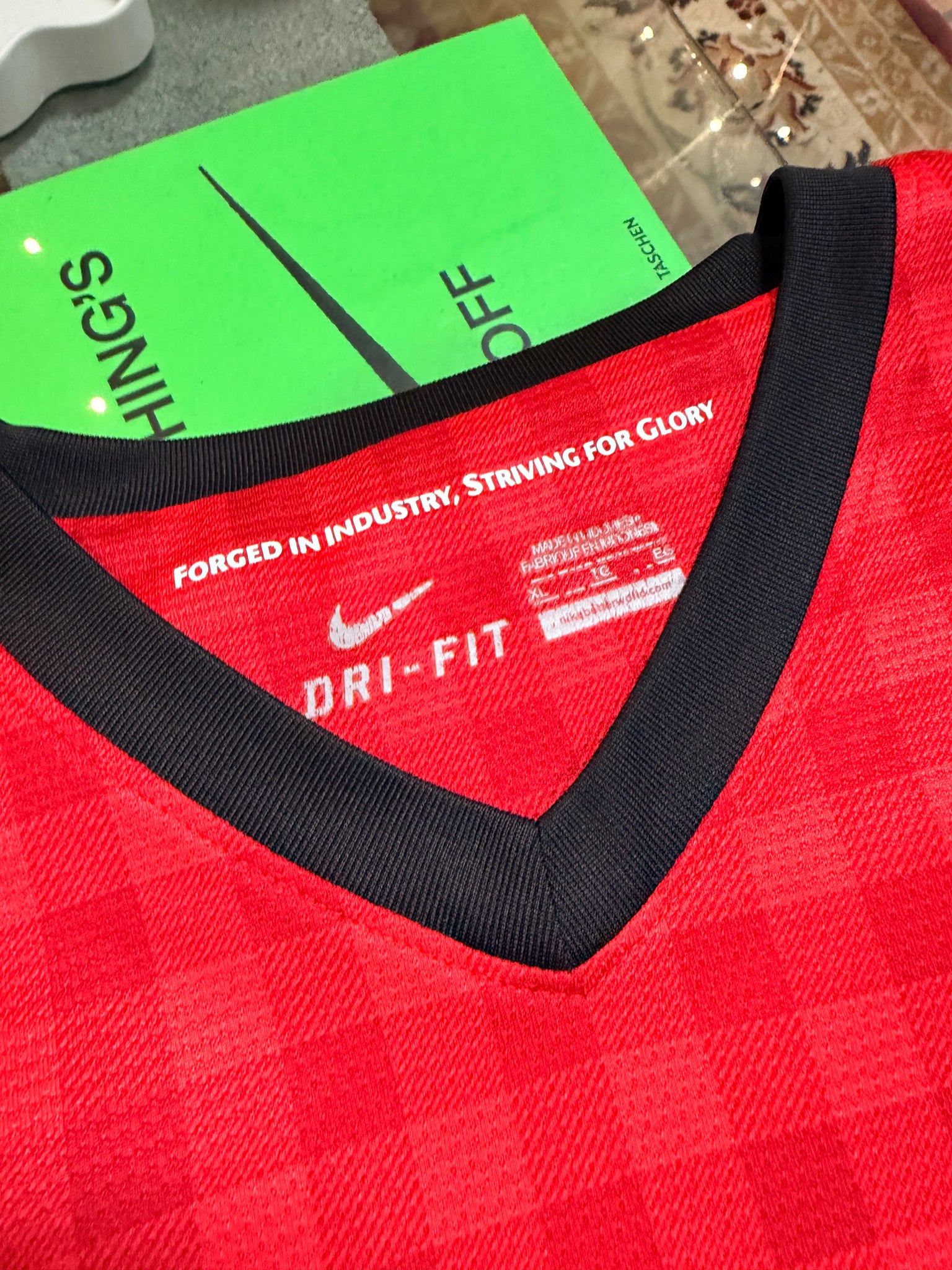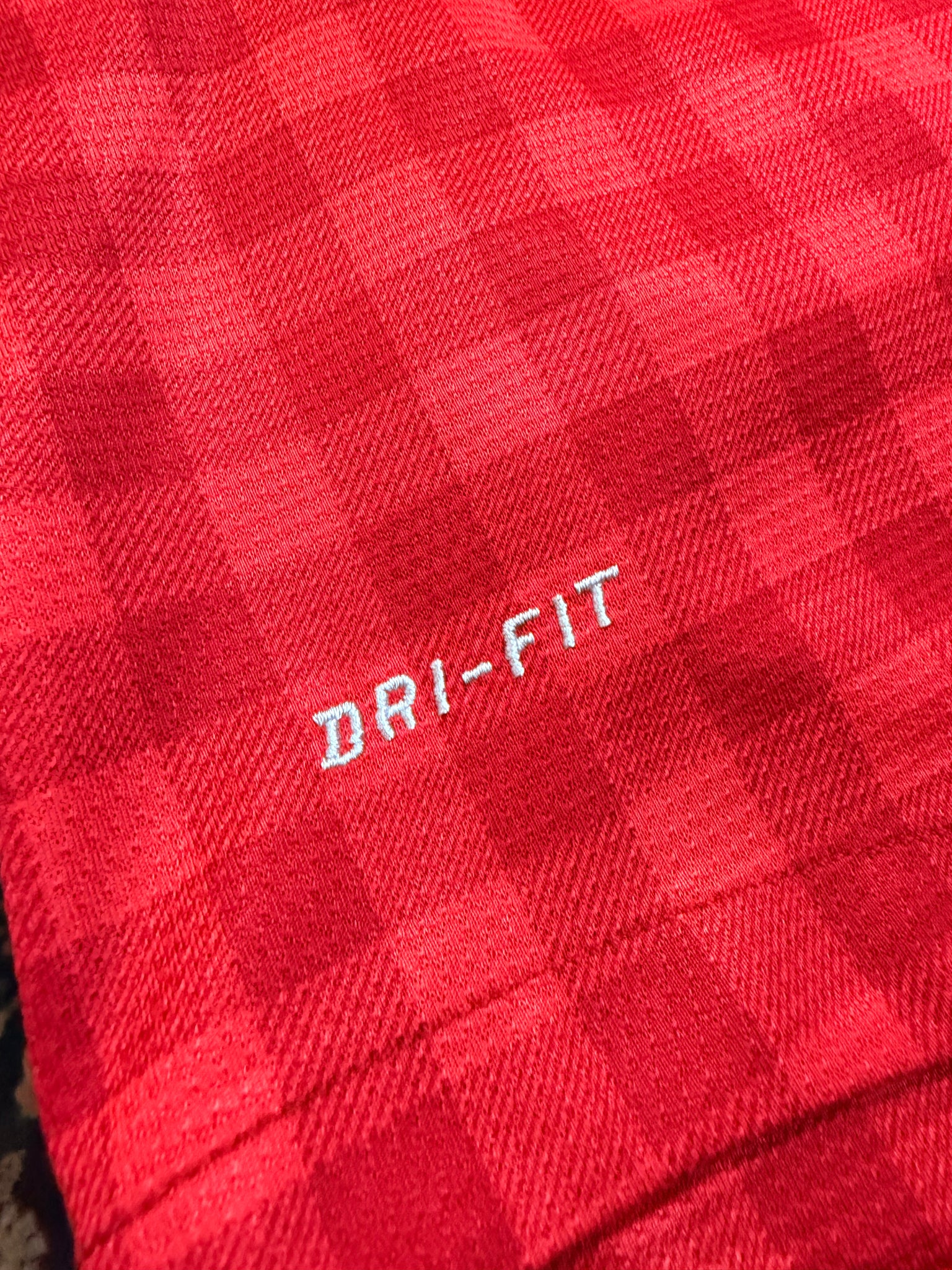 - Detail: Classic gingham-pattern United home kit from Sir Alex Ferguson’s final season; clean front with AON sponsor and embroidered crest