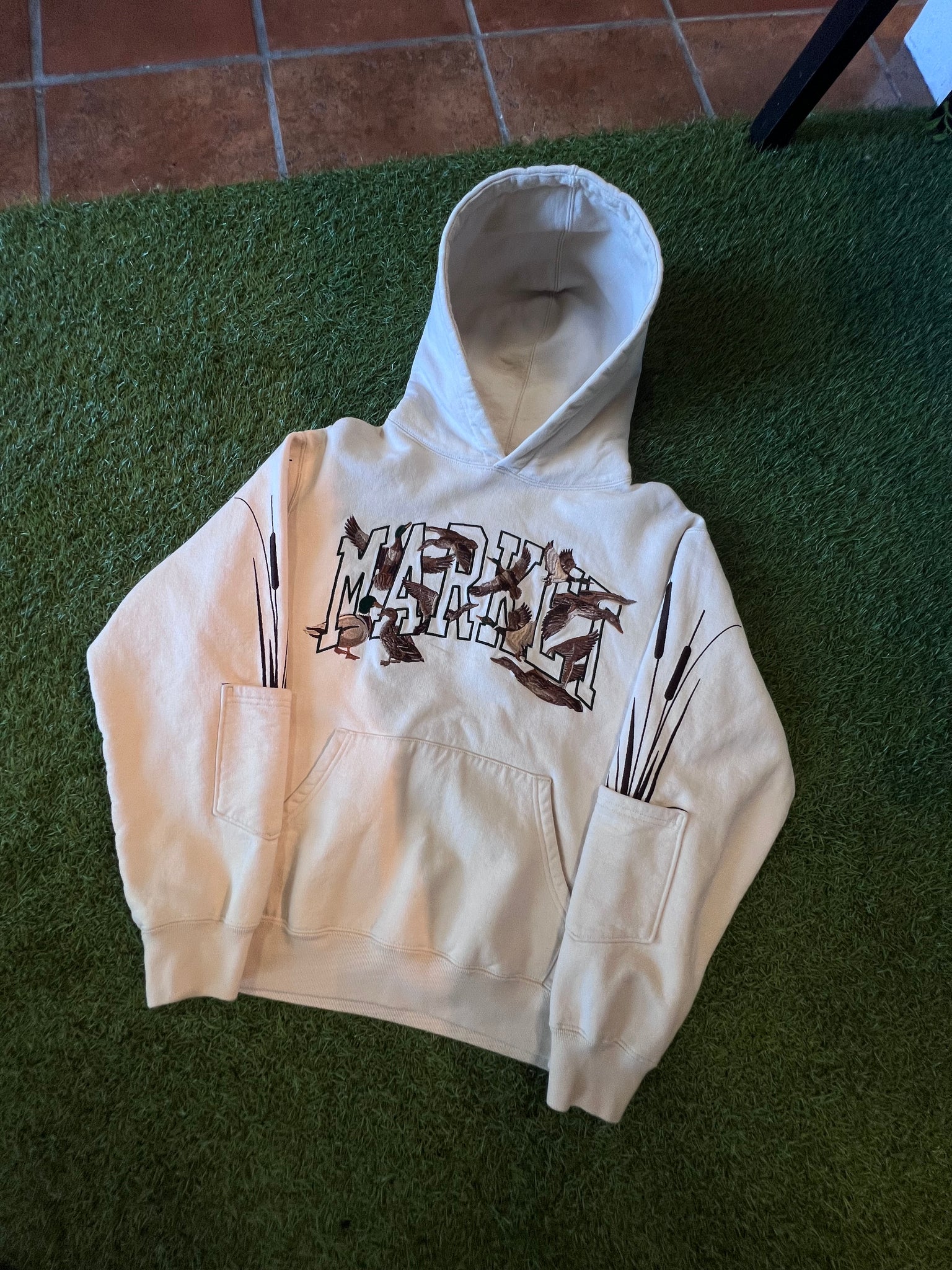 - Details: Graphic “MARKET” text across chest with flying duck print, reed details on sleeves, kangaroo pocket, adjustable hood, ribbed cuffs and hem