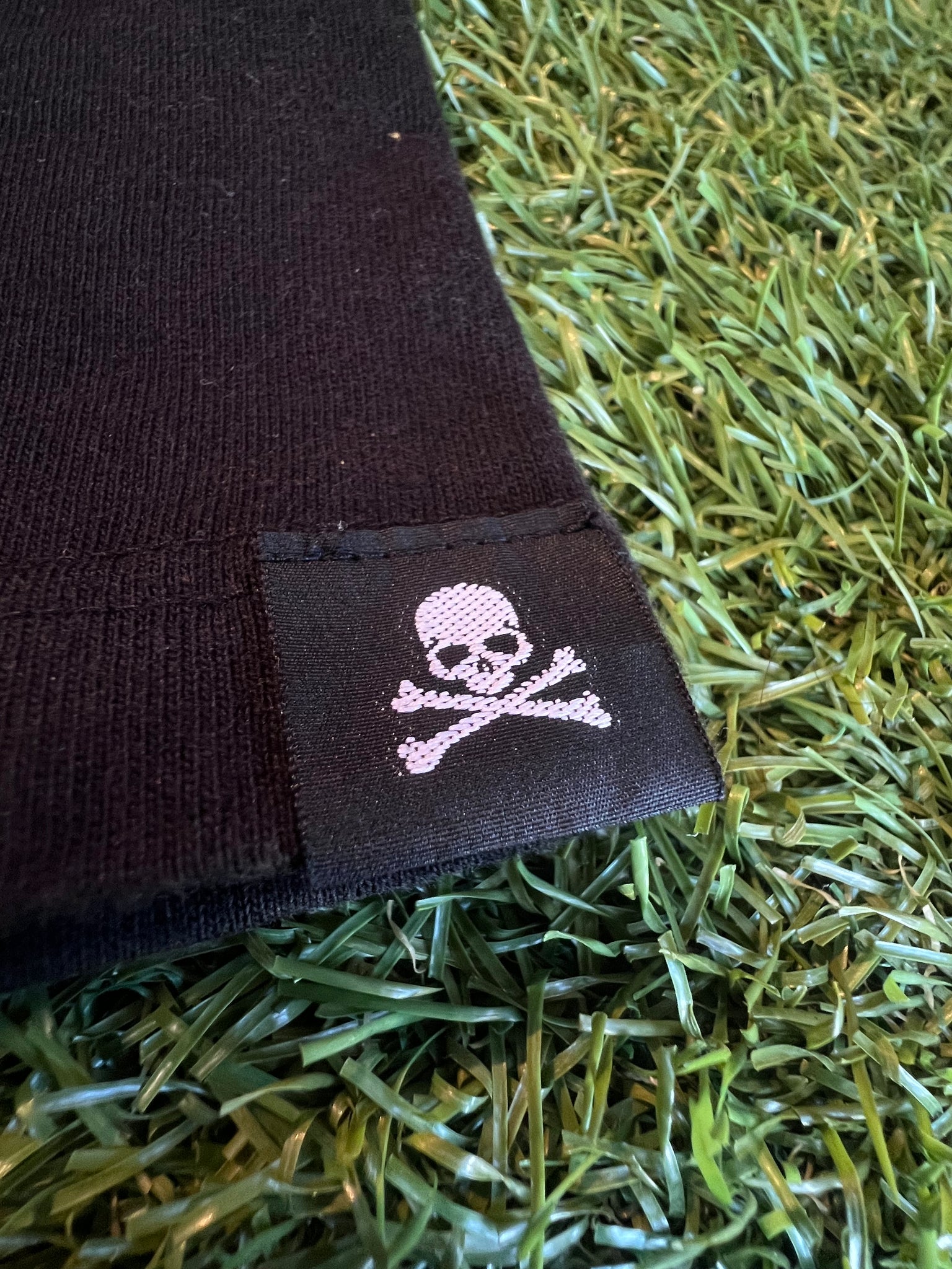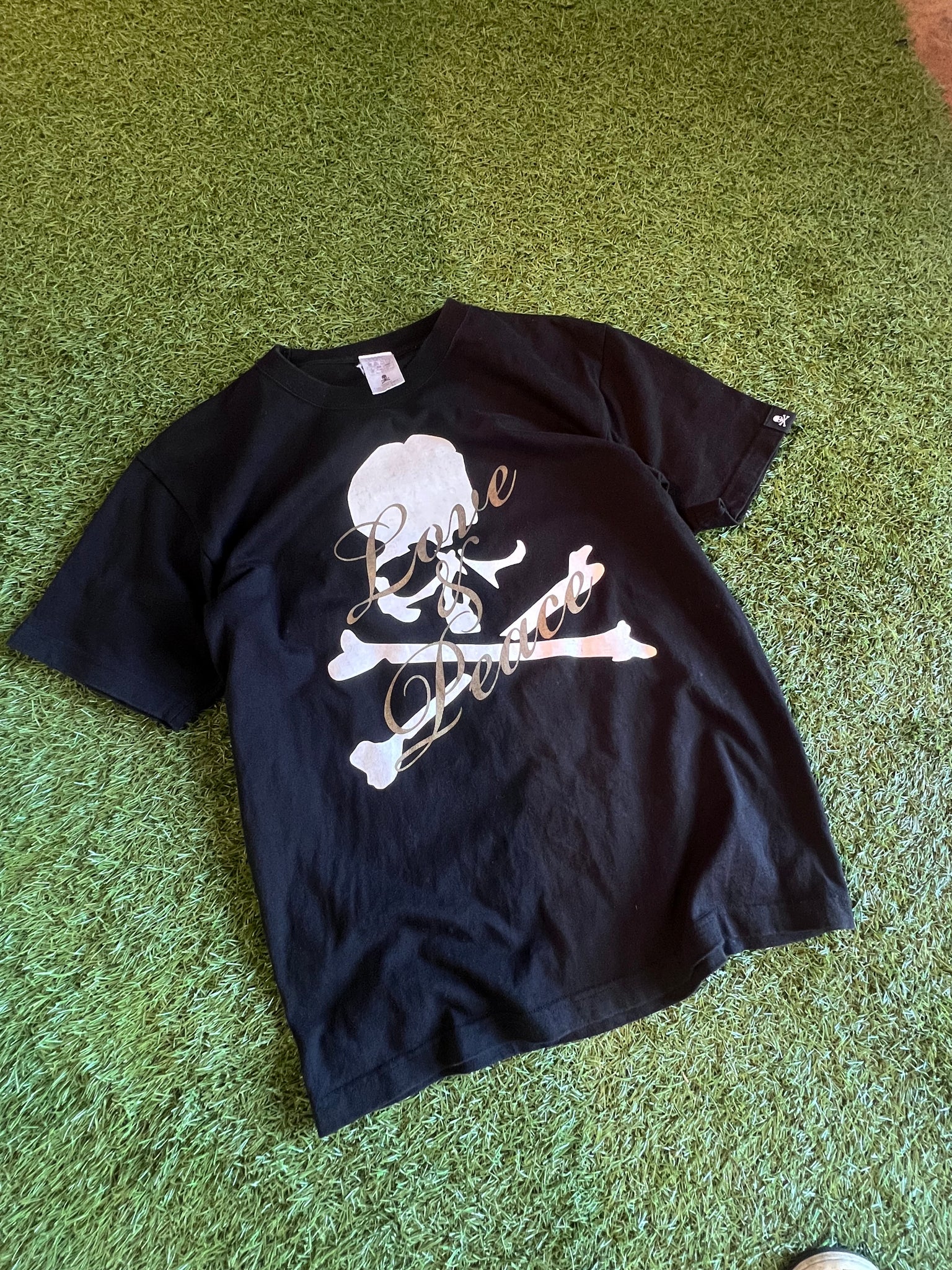 - Black tee with skull and crossbones graphic and “Love & Peace” text on front