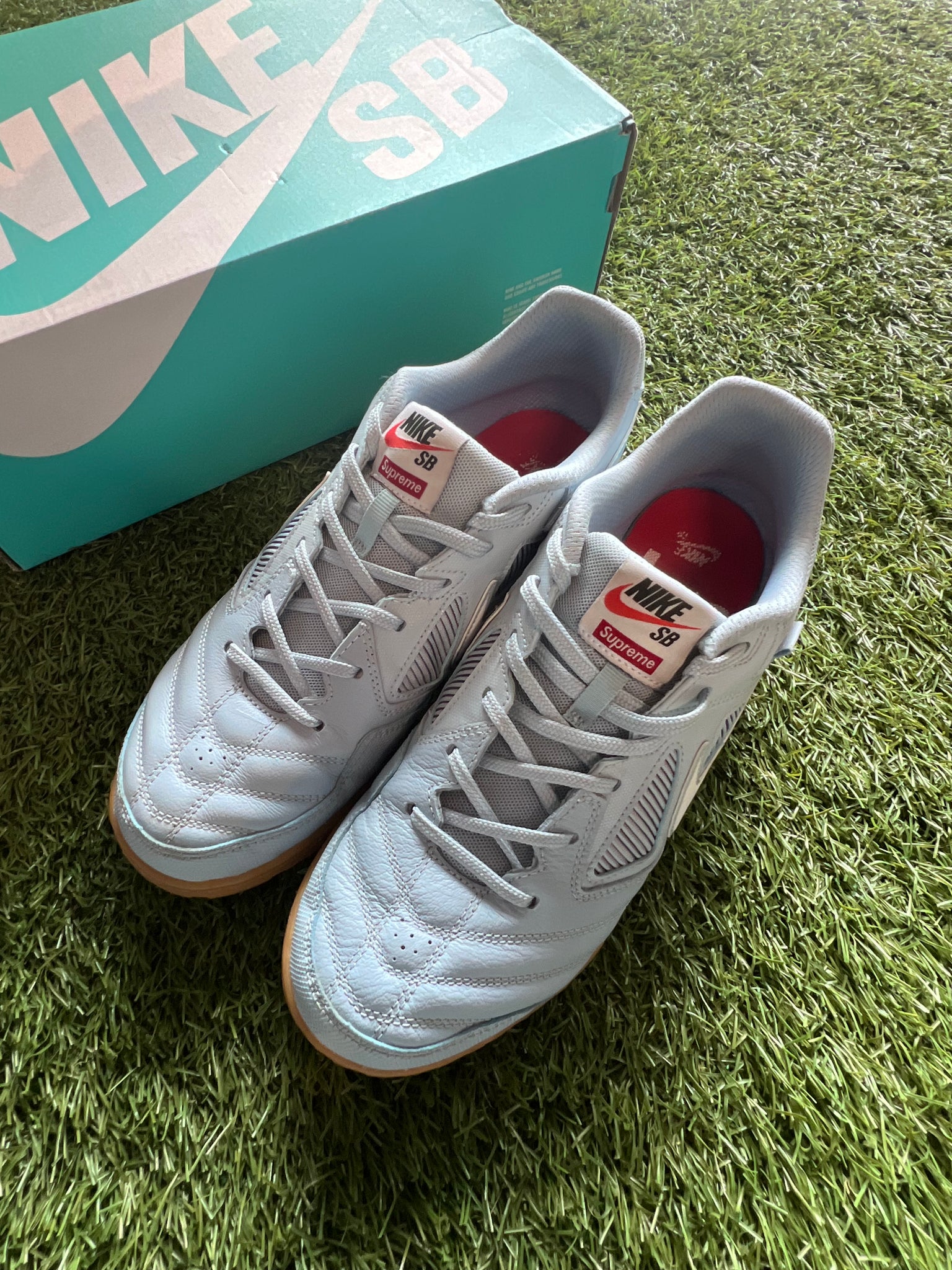 - Detail: Part of the rare 2018 Supreme x Nike SB Gato indoor soccer-inspired collab, featuring gum sole and bold Supreme branding on the tongue.