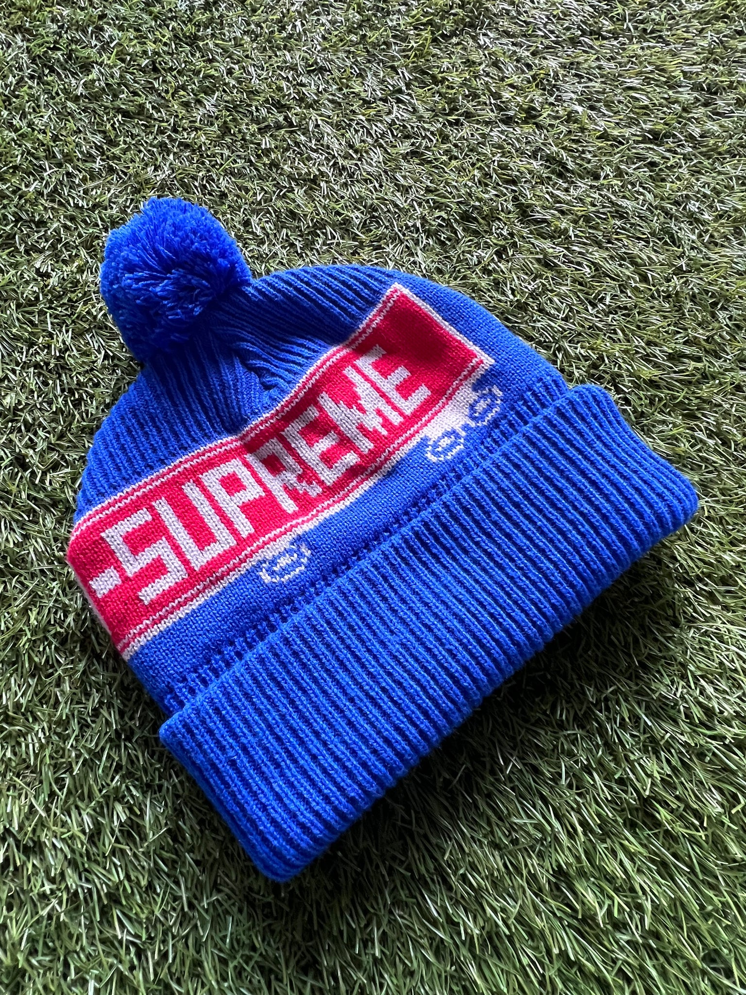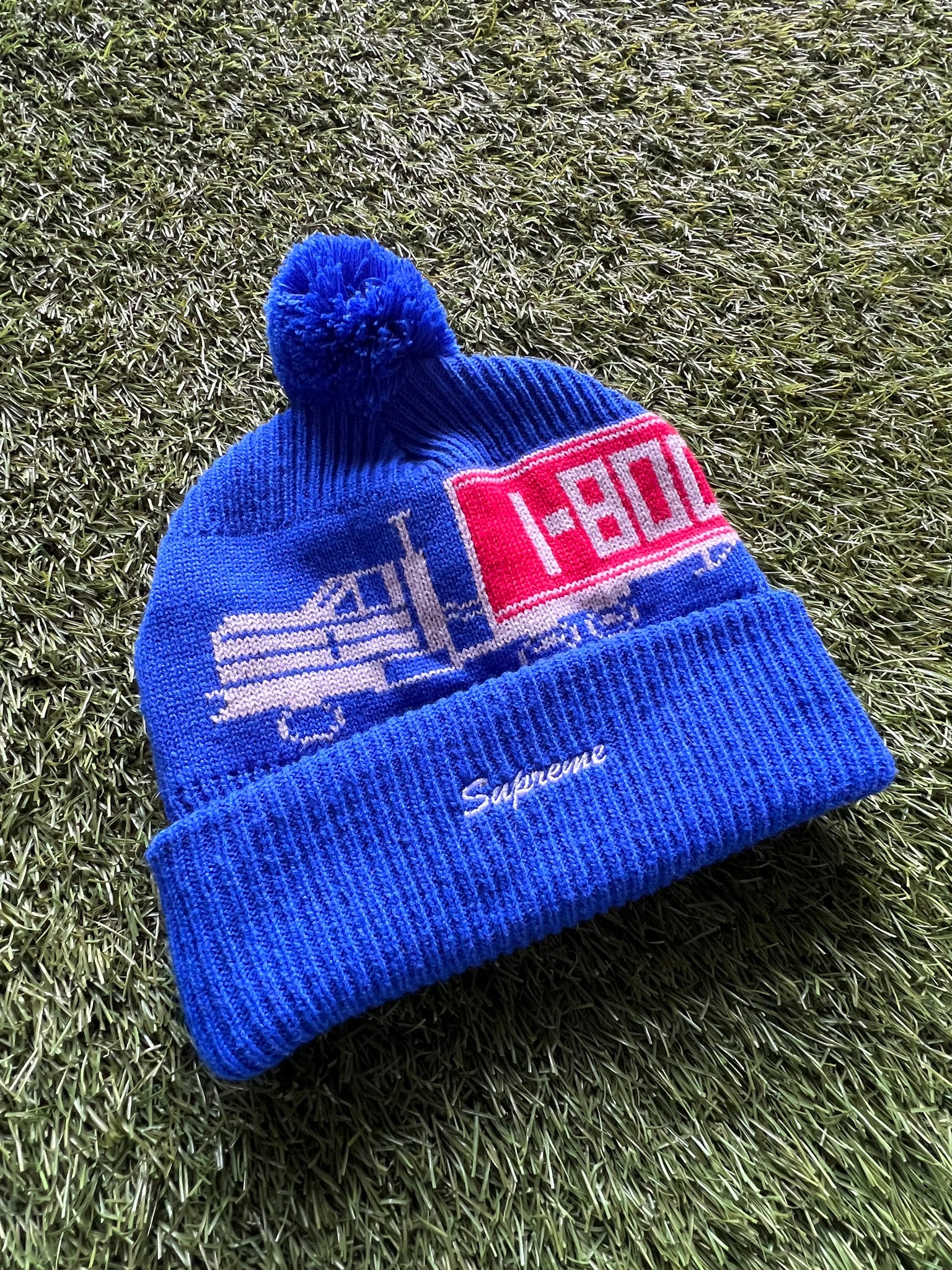 Colorway/Design: Royal Blue with red box logo & 1-800 truck graphic, pom top