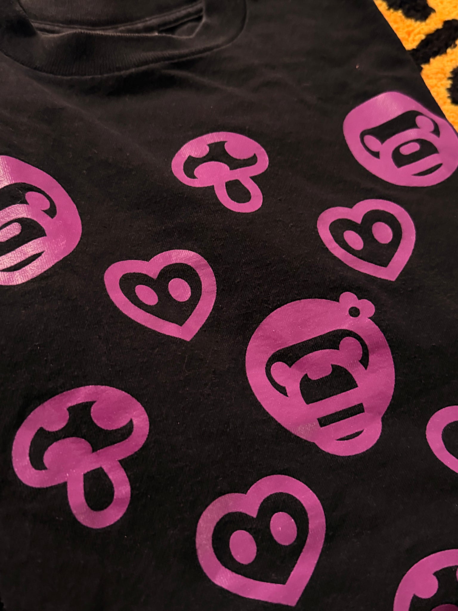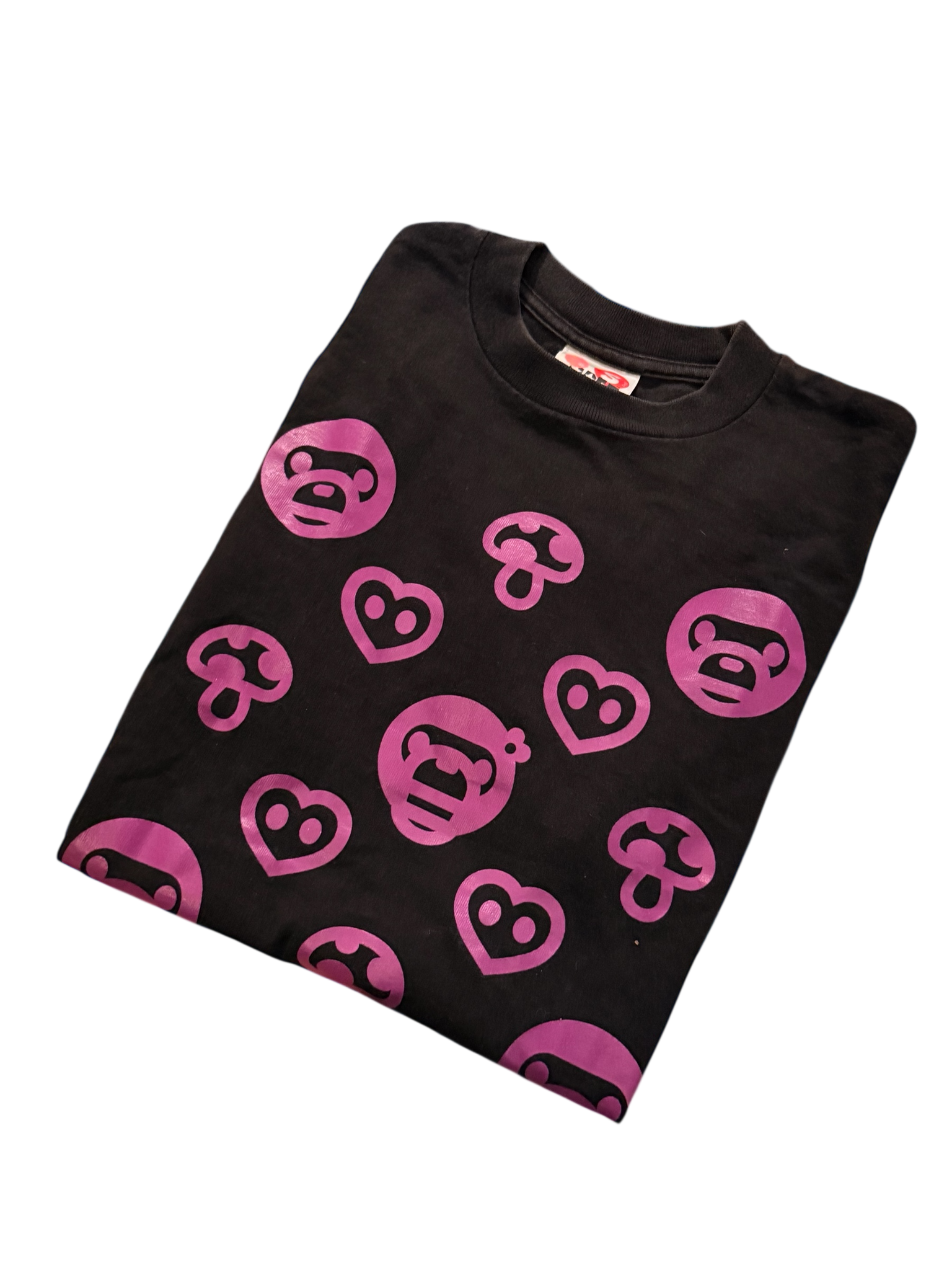 - Detail: All-over pink Baby Milo heads, heart logos, and mushroom icons on a black base